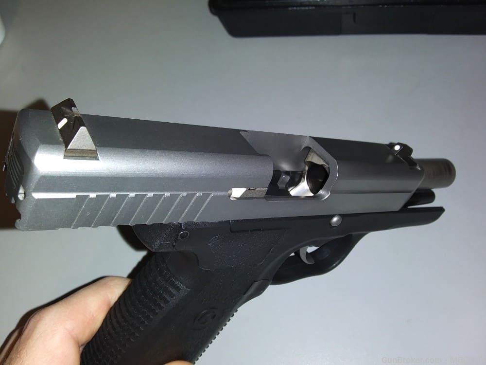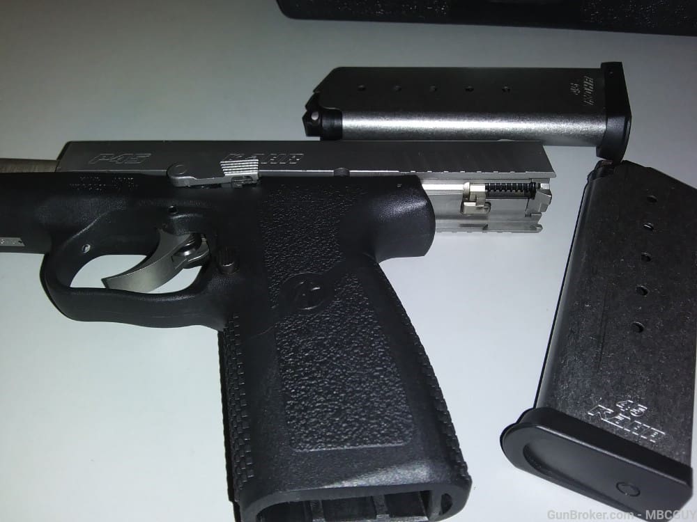 Check out our online firearms shop for products like Kahr P45 Handgun now. Caliber: .45 ACP Capacity: 6+1 Operation: Trigger cocking DAO; lock breech; “Browning – type” recoil lug; passive striker block; no magazine disconnect Barrel: 3.54″, polygonal rifling, 1 – 16.38 right-hand twist Length O/A: 6.07″ Height: 4.8″ Slide Width: 1.01″ Weight: Pistol 18.5 oz., Magazine 2 oz. Grips: good Textured polymer Sights: Drift adjustable, white bar-dot combat sight(t